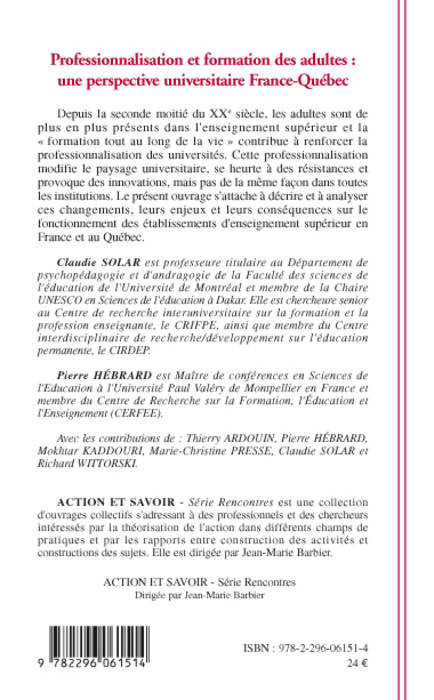Depuis la seconde moitié du XXe siècle, les adultes sont de plus en plus présents dans l'enseignement supérieur et la "formation tout au long de la vie" contribue à renforcer la professionnalisation des universités. Cette professionnalisation modifie le paysage universitaire, se heurte à des résistances et provoque des innovations, mais pas de la même façon dans toutes les institutions.