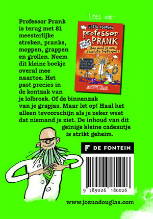 Professor Prank is terug met 81 meesterlijke streken, pranks, moppen, grappen en grollen. Neem dit kleine boekje overal mee naartoe. Het past precies in de kontzak van je lolbroek. Of de binnenzak van je grapjas. Maar let op! Haal het alleen tevoorschijn als je zeker weet dat niemand je ziet. De inhoud van dit geinige kleinood is strikt geheim.
