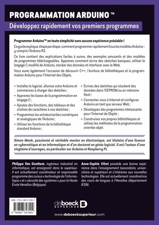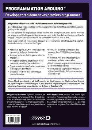 Le gourou de l'électronique, Simon Monk, traite de tous les concepts et de la syntaxe avec un langage simple et donne des instructions claires, conçues pour tout débutant. Programmer Arduino contient des dizaines d’exemples simples à suivre et d’illustrations de haute qualité. Tous les exemples présentés dans le livre peuvent être utilisés tels quels ou modifiés pour répondre à vos besoins.