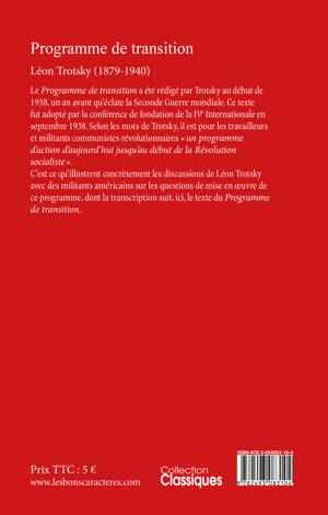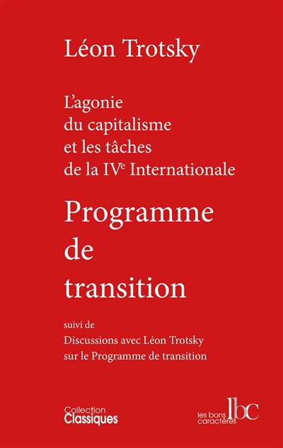 ²²²²²²²²²²²²²²²²²²²²²²²²²²²²²²²²²²²²²²²²²²²²²²²²²²²²²²²²²²²²²²²²²²²²²²²²²²²²²²²²²²²²²²²²²²²²²²²²²²²²²²²²²²²²²²²²²²²²²²²²²²²²²²²²²²²²²²²²²²²²²²²²²²²²²²²²²²²²²²²²²²²²²²²²²²²²²²²²²²²²²²²²²²²²²²²²²²²²Le titre original de ce texte était L'agonie du capitalisme et les tâches de la IVe Internationale (mobiliser les masses autour de revendications transitoires, afin de les préparer à la prise du pouvoir), titre bien vite résumé en Programme de transition. Celui-ci a été rédigé par Trotsky au début de 1938, un an avant qu'éclate la Seconde Guerre Mondiale. Ce texte fut adopté par la conférence de fondation de la IVe Internationale en septembre 1938. Selon les mots de Trotsky, il est pour les travailleurs et les militants communistes révolutionnaires « un programme d'action d'aujourd'hui jusqu'au début de la révolution sociale ». Traduit du russe à partir du texte du Bulletin de l'Opposition (Bolcheviks-Léninistes) - n° 66-67 - mai-juin 1938.