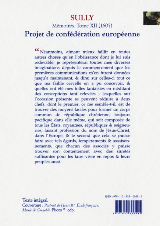 Néanmoins, aimant mieux faillir en toutes autres choses qu'en l'obéissance dont je lui suis redevable, je représenterai toutes mes diverses imaginations depuis le commencement que les premières communications m'en furent données jusqu'à maintenant, & dirai sur celles-ci tout ce que ma faible cervelle en a pu concevoir, & quelles ont été mes folles fantaisies en méditant des conceptions tant relevées ; lesquelles sur l'occasion présente se peuvent réduire à deux chefs, dont le premier, ce me semble-t-il, est de trouver des moyens faciles pour former un corps commun de république chrétienne, toujours pacifique dans elle même, qui soit composée de tous les États, royaumes, républiques & seigneuries, faisant profession du nom de Jésus-Christ, dans l'Europe, & le second que cela se puisse faire avec tels égards, tempéraments & assaisonnements, que chacun des associés y puisse trouver son contentement avec des sûretés suffisantes pour les faire vivre en repos & leurs peuples aussi.