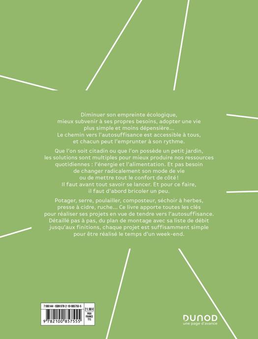 Vivre en autonomie et plus simplement, moins dépenser, avoir moins d’impact sur l’environnement… l’auto-suffisance est une tendance actuelle, renforcée par les années de Covid et la crise énergétique à venir. Que l’on soit citadin ou que l’on possède un petit jardin, les solutions sont multiples pour mieux produire les ressources dont nous avons besoin : l’énergie et la nourriture. Et pas besoin de changer radicalement son mode de vie ou de mettre le confort de côté ! Potager saisonnier, poulailler, four solaire, séchoir à herbes, cidre maison, garde-manger… Ce livre apporte toutes les clés pour réaliser ses projets de bricolage en vue de tendre vers l'auto-suffisance. Détaillés pas à pas, du plan de montage avec sa liste de débit jusqu’aux finitions, chaque projet est suffisamment simple pour être réalisé le temps d’un week-end.