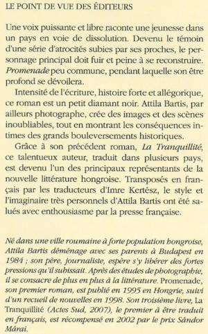 Une voix puissante et libre raconte une jeunesse dans un pays en voie de dissolution. Devenu le témoin d'une série d'atrocités subies par ses proches, le personnage principal doit fuir et peine à se reconstruire. «Promenade »peu commune, pendant laquelle son être profond se dévoilera. Intensité de l'écriture, histoire forte et allégorique, ce roman est un petit diamant noir. Attila Bartis, par ailleurs photographie, crée des images et des scènes inoubliables, tout en montrant les conséquences intimes des grands boulversements historiques. Grâce à son précédent roman, «La Tranquillité», ce talentueux auteur, traduit dans plusieurs pays, est devenu l'un des pricipaux représentants de la nouvelle littérature hogroise. Transposés en français par les traducteurs d'Imre Kertész, le style et l'imaginaire très personnels d'Attila Bartis ont été salués avec enthousiasme par la presse française.