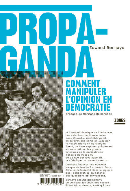 " LE manuel classique de l'industrie des relations publiques " selon Noam Chomsky. " LE manuel classique de l'industrie des relations publiques " selon Noam Chomsky. Véritable petit guide pratique écrit en 1928 par le neveu américain de Sigmund Freud, ce livre expose cyniquement et sans détour les grands principes de la manipulation mentale de masse ou de ce que Bernays appelait la " fabrique du consentement ". Comment imposer une nouvelle marque de lessive ? Comment faire élire un président ? Dans la logique des " démocraties de marché ", ces questions se confondent. Bernays assume pleinement ce constat : les choix des masses étant déterminants, ceux qui parviendront à les influencer détiendront réellement le pouvoir. La démocratie moderne implique une nouvelle forme de gouvernement, invisible : la propagande. Loin d'en faire la critique, l'auteur se propose d'en perfectionner et d'en systématiser les techniques, à partir des acquis de la psychanalyse. Un document édifiant où l'on apprend que la propagande politique au XXe siècle n'est pas née dans les régimes totalitaires, mais au coeur même de la démocratie libérale américaine.
