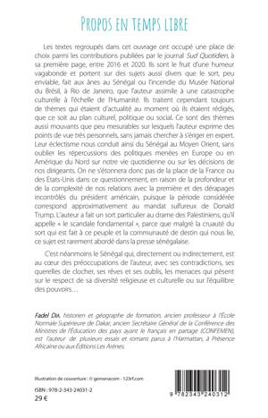 Les textes regroupés dans cet ouvrage ont occupé une place de choix parmi les contributions publiées par le journal Sud Quotidien, à sa première page, entre 2016 et 2020. Ils sont le fruit d'une humeur vagabonde et portent sur des sujets aussi divers que le sort, peu enviable, fait aux ânes au Sénégal ou l'incendie du Musée National du Brésil, à Rio de Janeiro. Ils traitent cependant toujours de thèmes qui étaient d'actualité au moment où ils étaient rédigés, que ce soit au plan culturel, politique ou social. C'est néanmoins le Sénégal qui, directement ou indirectement, est au coeur des préoccupations de l'auteur, avec ses contradictions, ses querelles de clocher, ses rêves et ses oublis, les menaces qui pèsent sur le respect de sa diversité religieuse et culturelle ou sur l'équilibre des pouvoirs...