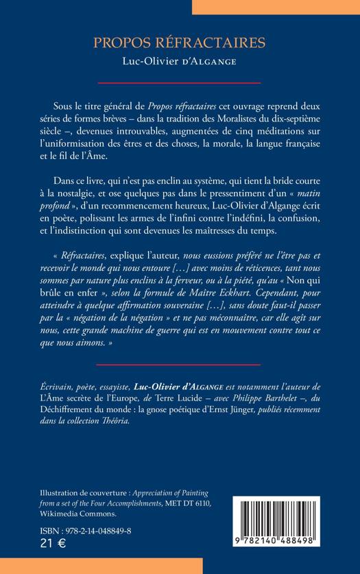 Ces Propos réfractaires reprennent deux séries de formes brèves dans la tradition des Moralistes du dix-septième siècle , devenues introuvables, augmentées de cinq méditations sur l'uniformisation des êtres et des choses, la morale, la langue française et le fil de l'Âme. Dans ce livre, qui n'est pas enclin au système, qui tient la bride courte à la nostalgie, et ose quelques pas dans le pressentiment d'un « matin profond », d'un recommencement heureux, Luc-Olivier d'Algange écrit en poète, polissant les armes de l'infini contre l'indéfini, la confusion, et l'indistinction qui sont devenues les maîtresses du temps. « Réfractaires, explique l'auteur, nous eussions préféré ne l'être pas et recevoir le monde qui nous entoure [ ] avec moins de réticences, tant nous sommes par nature plus enclins à la ferveur, ou à la piété, qu'au « Non qui brûle en enfer », selon la formule de Maître Eckhart. Cependant, pour atteindre à quelque affirmation souveraine [ ], sans doute faut-il passer par la « négation de la négation » et ne pas méconnaître, car elle agît sur nous, cette grande machine de guerre qui est en mouvement contre tout ce que nous aimons. »