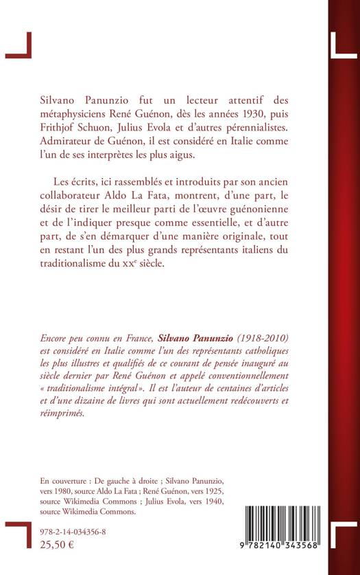 Silvano Panunzio fut un lecteur attentif des métaphysiciens René Guénon, dès les années 1930, puis Frithjof Schuon, Julius Evola et d'autres pérennialistes. Admirateur de Guénon, il est considéré en Italie comme l'un de ses interprètes les plus aigus. Les écrits, ici rassemblés et introduits par son ancien collaborateur Aldo La Fata, montrent, d'une part, le désir de tirer le meilleur parti de l'oeuvre guénonienne et de l'indiquer presque comme essentielle, et d'autre part, de s'en démarquer d'une manière originale, tout en restant l'un des plus grands représentants italiens du traditionalisme du XXe siècle.