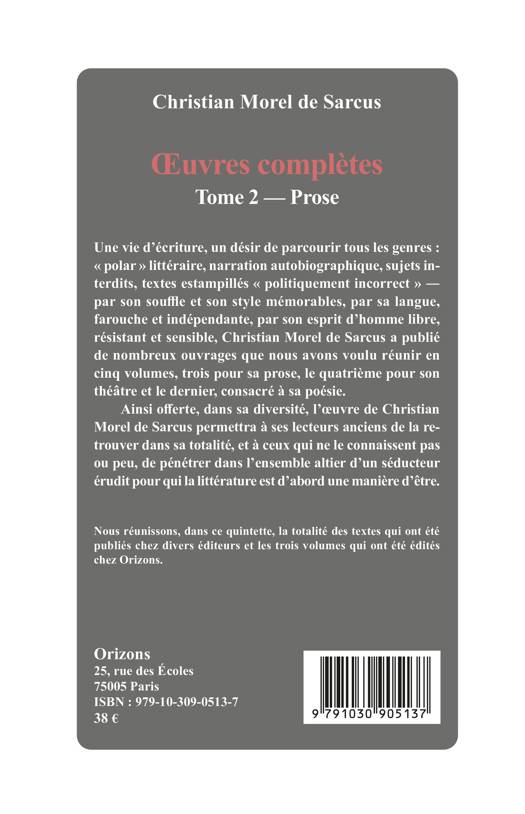 Une vie d’écriture, un désir de parcourir tous les genres : « polar » littéraire, narration autobiographique, sujets interdits, textes estampillés « politiquement incorrect » ― par son souffle et son style mémorables, par sa langue, farouche et indépendante, par son esprit d’homme libre, résistant et sensible, Christian Morel de Sarcus a publié de nombreux ouvrages que nous avons voulu réunir en quatre volumes, trois pour sa prose, le dernier consacré à son théâtre et à sa poésie.