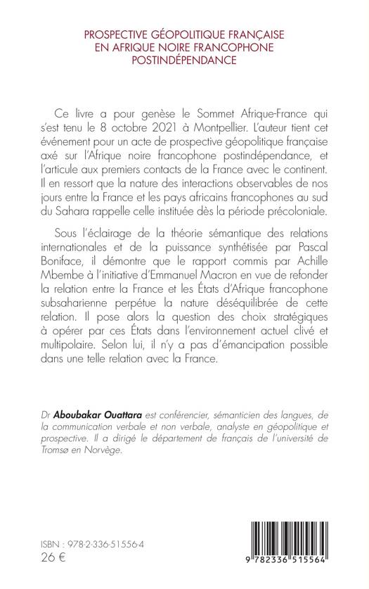 Ce livre a pour genèse le Sommet Afrique-France qui s'est tenu le 8 octobre 2021 à Montpellier. L'auteur tient cet événement pour un acte de prospective géopolitique française axé sur l'Afrique noire francophone postindépendance, et l'articule aux premiers contacts de la France avec le continent. Il en ressort que la nature des interactions observables de nos jours entre la France et les pays africains francophones au sud du Sahara rappelle celle instituée dès la période précoloniale. Sous l'éclairage de la théorie sémantique des relations internationales et de la puissance synthétisée par Pascal Boniface, il démontre que le rapport commis par Achille Mbembe à l'initiative d'Emmanuel Macron en vue de refonder la relation entre la France et les États d'Afrique francophone subsaharienne perpétue la nature déséquilibrée de cette relation. Il pose alors la question des choix stratégiques à opérer par ces États dans l'environnement actuel clivé et multipolaire. Selon lui, il n'y a pas d'émancipation possible dans une telle relation avec la France.