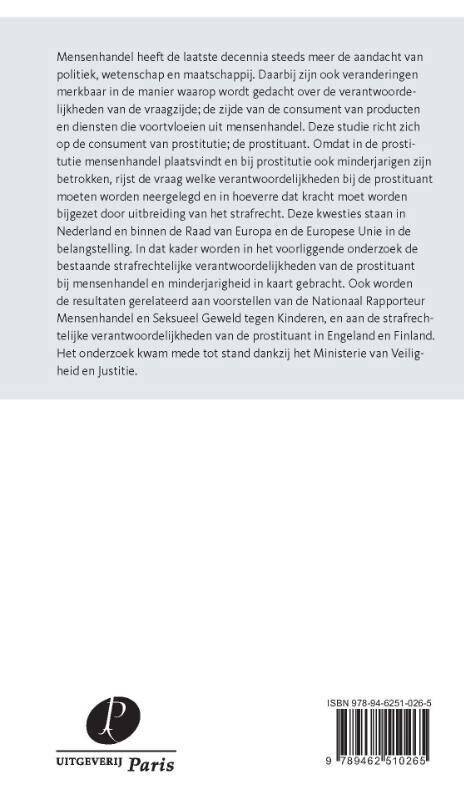Mensenhandel heeft de laatste decennia steeds meer de aandacht van politiek, wetenschap en maatschappij. Daarbij zijn ook veranderingen merkbaar in de manier waarop wordt gedacht over de verantwoordelijkheden van de vraagzijde; de zijde van de consument van producten en diensten die voortvloeien uit mensenhandel. Deze studie richt zich op de consument van prostitutie; de prostituant. Omdat in de prostitutie mensenhandel plaatsvindt en bij prostitutie ook minderjarigen zijn betrokken, rijst de vraag welke verantwoordelijkheden bij de prostituant moeten worden neergelegd en in hoeverre dat kracht moet worden bijgezet door uitbreiding van het strafrecht. Deze kwesties staan in Nederland en binnen de Raad van Europa en de Europese Unie in de belangstelling. In dat kader worden in het voorliggende onderzoek de bestaande strafrechtelijke verantwoordelijkheden van de prostituant bij mensenhandel en minderjarigheid in kaart gebracht. Ook worden de resultaten gerelateerd aan voorstellen van de Nationaal Rapporteur Mensenhandel en Seksueel Geweld tegen Kinderen, en aan de strafrechtelijke verantwoordelijkheden van de prostituant in Engeland en Finland. Het onderzoek kwam mede tot stand dankzij het Ministerie van Veiligheid en Justitie.