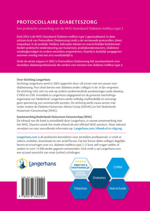 Eind 2024 is de NHG-Standaard Diabetes mellitus type 2 geactualiseerd. In deze achtste druk van Protocollaire Diabeteszorg vindt u de vernieuwde protocollen, direct toepasbaar in de praktijk. Heldere, beknopte teksten en overzichtelijke beslisbomen bieden praktische ondersteuning aan huisartsen, praktijkondersteuners, (diabetes) verpleegkundigen en andere eerstelijns zorgverleners. Daarbij is duidelijk aangegeven wanneer overleg met een arts noodzakelijk is. Sinds de eerste uitgave in 2002 is Protocollaire Diabeteszorg hét standaardwerk voor eerstelijns diabetesprofessionals die werken met mensen met diabetes mellitus type 2.