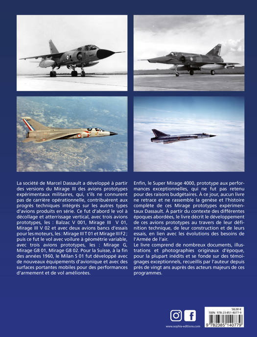 La société de Marcel Dassault a développé à partir des versions du Mirage III des avions prototypes expérimentaux militaires, qui, s’ils ne connurent pas de carrière opérationnelle, contribuèrent aux progrès techniques intégrés sur les autres types d’avions produits en série. Ce fut d’abord le vol à décollage et atterrissage vertical, avec trois avions prototypes, les : Balzac V 001, Mirage III V 01, Mirage III V 02 et avec deux avions bancs d’essais pour les moteurs, les : Mirage III T 01 et Mirage III F2 ; puis ce fut le vol avec voilure à géométrie variable, avec trois avions prototypes, les : Mirage G, Mirage G8 01, Mirage G8 02. Pour la Suisse, à la fin des années 1960, le Milan S 01 fut développé avec de nouveaux équipements d’avionique et avec des surfaces portantes mobiles pour des performances d’armement et de vol améliorées. Enfin, le Super Mirage 4000, prototype aux performances exceptionnelles, qui ne fut pas retenu pour des raisons budgétaires. Le livre comprend de nombreux documents, illustrations et photographies originaux d’époque, pour la plupart inédits et se fonde sur des témoignages exceptionnels, recueillis par l’auteur depuis près de vingt ans auprès des acteurs majeurs de ces programmes.