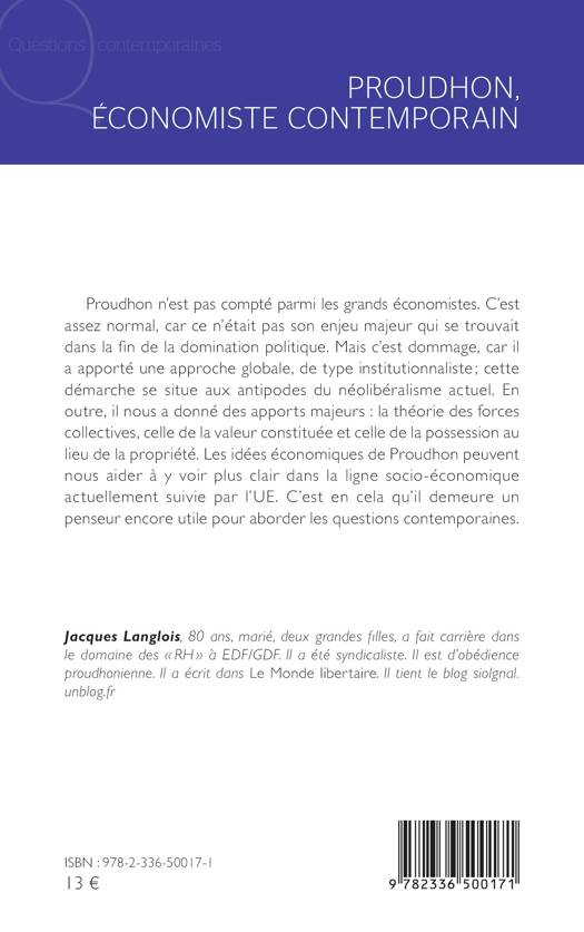 Proudhon n’est pas compté parmi les grands économistes. C’est assez normal, car ce n’était pas son enjeu majeur qui se trouvait dans la fin de la domination politique. Mais c’est dommage, car il a apporté une approche globale, de type institutionnaliste ; cette démarche se situe aux antipodes du néolibéralisme actuel. En outre, il nous a donné des apports majeurs : la théorie des forces collectives, celle de la valeur constituée et celle de la possession au lieu de la propriété. Les idées économiques de Proudhon peuvent nous aider à y voir plus clair dans la ligne socio-économique actuellement suivie par l’UE. C’est en cela qu’il demeure un penseur encore utile pour aborder les questions contemporaines.