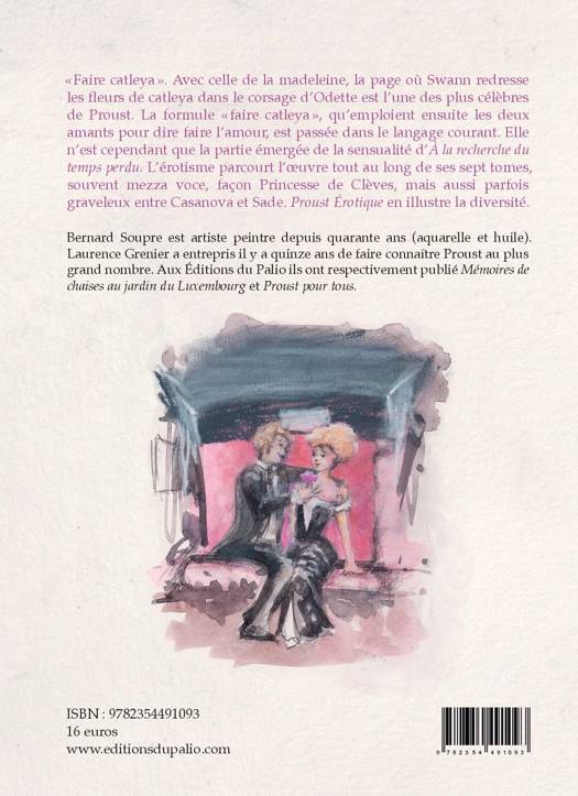 "Faire catleya". Avec celle de la madeleine, la page où Swann redresse les fleurs de catleya dans le corsage d’Odette est l’une des plus célèbres de Proust. La formule "faire catleya", qu’emploient ensuite les deux amants pour dire faire l’amour, est passée dans le langage courant. Elle n’est cependant que la partie émergée de la sensualité d’ "À la recherche du temps perdu". L’érotisme parcourt l'oeuvre tout au long de ses sept tomes, souvent mezza voce, façon Princesse de Clèves, mais aussi parfois graveleux entre Casanova et Sade. Par son choix d’extraits commentés de la "Recherche" et les aquarelles qui les accompagnent, "Proust Érotique" en illustre la diversité. Bernard Soupre est artiste peintre depuis quarante ans (aquarelle et huile). Laurence Grenier a entrepris il y a quinze ans de faire connaître Proust au plus grand nombre. Aux Éditions du Palio ils ont respectivement publié "Mémoires de chaises au jardin du Luxembourg" et "Proust pour tous".