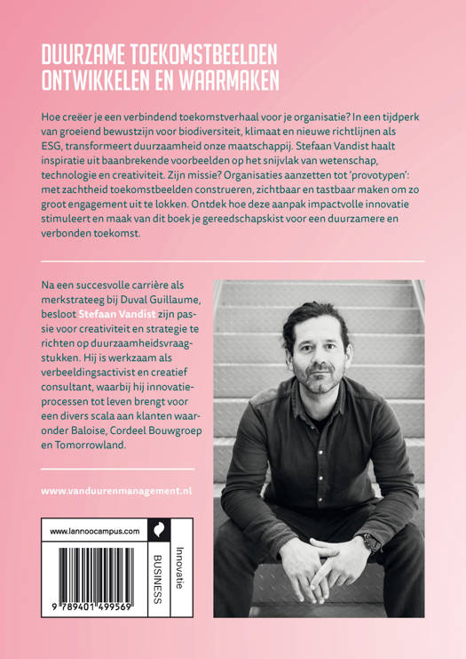 Hoe creëer je een verbindend toekomstverhaal voor je organisatie? In een tijdperk van groeiend bewustzijn voor biodiversiteit, klimaat en nieuwe richtlijnen als ESG, transformeert duurzaamheid onze maatschappij. Stefaan Vandist haalt inspiratie uit baanbrekende voorbeelden op het snijvlak van wetenschap, technologie en creativiteit. Zijn missie? Organisaties aanzetten tot 'provotypen': met zachtheid toekomstbeelden construeren, zichtbaar en tastbaar maken om zo groot engagement uit te lokken. Ontdek hoe deze aanpak impactvolle innovatie stimuleert en maak van dit boek je gereedschapskist voor een duurzamere en verbonden toekomst.