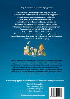 'Nog 11 minuten voor vernietiging basis.' Boven de raket schoof het plafond langzaam open. Een staalblauwe lucht verscheen. Sam en Nick waggelden de capsule in en trokken de deur achter zich dicht. 'Snel, we moeten ons in de stoelen vastgespen voor de raket vertrekt!', brulde Sam. Nick plofte in een van de stoelen en trok de verschillende gordels over zich heen. De motoren begonnen te grommen en te brommen, steeds harder. Nick voelde de raket onder zich trillen en beven. Hij knelde de armsteunen van zijn stoel krampachtig vast. Een oorverdovend lawaai vulde de cabine. 'Tien ... Negen ... Vijf ... Drie ... Twee ... Een ... GO!' Nick werd met een ruk tegen de rugleuning van zijn stoel gedrukt. Temidden van een enorme wolk van stoom en rook kwam de raket in beweging. Steeds sneller en sneller. Weg van de aarde.