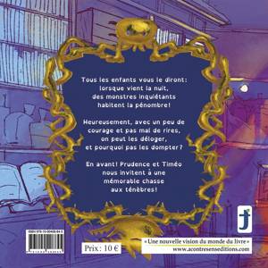Argumentaire : Dans la lignée des autres tomes de la série « Prudence et Timéo dompteurs de monstres », ce récit aborde de façon originale et ludique une des phobies les plus classiques de l’enfance : la peur du noir. Par l’humour, et en s’appuyant sur des illustrations colorées d’une grande qualité, l’album permet de désamorcer les craintes des tout-petits en valorisant la découverte de l’espace qui les entoure, avec l’aide des adultes, bien entendu. Par ailleurs, le texte, semi-rimé, apporte une musicalité que les enfants apprécieront en découvrant l’histoire. Pour frissonner… de plaisir !