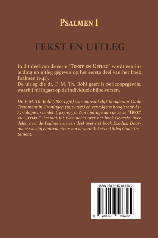 Dr. F. M. Th. Böhl (1882-1976) was aanvankelijk hoogleraar Oude Testament in Groningen (1912-1927) en vervolgens hoogleraar Assyriologie in Leiden (1927-1953). Zijn bijdrage aan de serie “Tekst en Uitleg” bestaat uit twee delen over het boek Genesis, twee delen over de Psalmen en een deel over het boek Exodus. Daarnaast was hij eindredacteur van de serie Tekst en Uitleg Oude Testament.