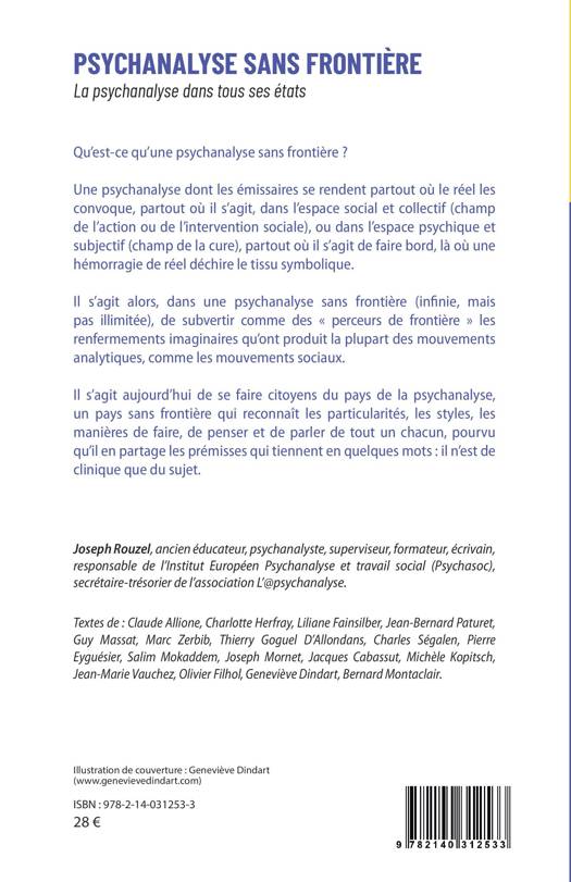 Qu'est-ce qu'une psychanalyse sans frontière ? Une psychanalyse dont les émissaires se rendent partout où le réel les convoque, partout où il s'agit, dans l'espace social et collectif (champ de l'action ou de l'intervention sociale), ou dans l'espace psychique et subjectif (champ de la cure), partout où il s'agit de faire bord, là où une hémorragie de réel déchire le tissu symbolique. Il s'agit alors, dans une psychanalyse sans frontière (infinie, mais pas illimitée), de subvertir comme des perceurs de frontière les renfermements imaginaires qu'ont produit la plupart des mouvements analytiques, comme les mouvements sociaux. Il s'agit aujourd'hui de se faire citoyens du pays de la psychanalyse, un pays sans frontière qui reconnaît les particularités, les styles, les manières de faire, de penser et de parler de tout un chacun, pourvu qu'il en partage les prémisses qui tiennent en quelques mots: il n'est de clinique que du sujet.