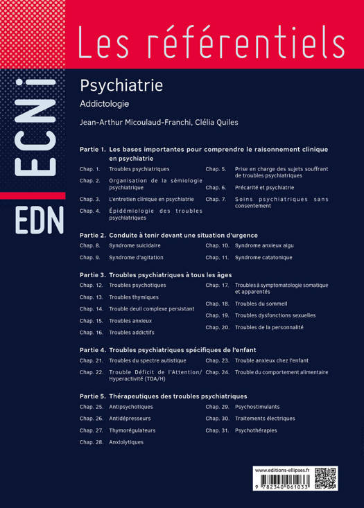Proposant des ouvrages de cours de référence, la collection ECNi - LES RÉFÉRENTIELS tient compte de l’évolution des enseignements et des besoins des étudiants qui préparent les ECNi. Ses auteurs.rices – tou.te.s exerçant en services universitaires - s’attachent à fournir au lecteur.rices un outil complet de révisions, conforme au programme du concours. Dans cet ouvrage, le programme de la spécialité Psychiatrie est traité de façon complète, avec :