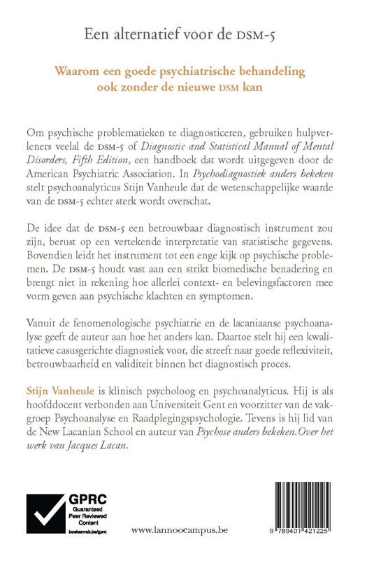 Waarom een goede psychiatrische behandeling ook zonder de nieuwe dsm kan Om psychische problematieken te diagnosticeren, gebruiken hulpverleners veelal de dsm-5 of Diagnostic and Statistical Manual of Mental Disorders, Fifth Edition, een handboek dat wordt uitgegeven door de American Psychiatric Association. In Psychodiagnostiek anders bekeken stelt psychoanalyticus Stijn Vanheule dat de wetenschappelijke waarde van de dsm-5 echter sterk wordt overschat. De idee dat de dsm-5 een betrouwbaar diagnostisch instrument zou zijn, berust op een vertekende interpretatie van statistische gegevens. Bovendien leidt het instrument tot een enge kijk op psychische problemen. De dsm-5 houdt vast aan een strikt biomedische benadering en brengt niet in rekening hoe allerlei context- en belevingsfactoren mee vorm geven aan psychische klachten en symptomen. Vanuit de fenomenologische psychiatrie en de lacaniaanse psychoanalyse geeft de auteur aan hoe het anders kan. Daartoe stelt hij een kwalitatieve casusgerichte diagnostiek voor, die streeft naar goede reflexiviteit, betrouwbaarheid en validiteit binnen het diagnostisch proces.