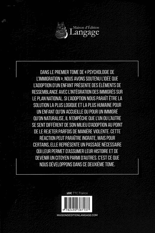 Dans le premier tome de "Psychologie de l’immigration", nous avons soutenu l’idée que l’adoption d’un enfant présente des éléments de ressemblance avec l’intégration des immigrés sur le plan national. Si l’adoption nous paraît être la solution la plus logique et la plus humaine pour un enfant qu’on accueille ou pour un immigré qu’on naturalise, il n’empêche que l’un ou l’autre se sent différent de son milieu d’adoption au point de le rejeter parfois de manière violente. Cette réaction peut paraître ingrate, mais pour certains, elle représente un passage nécessaire qui leur permet d’assumer leur histoire et de devenir un citoyen parmi d’autres. C’est ce que nous développons dans ce deuxième tome.