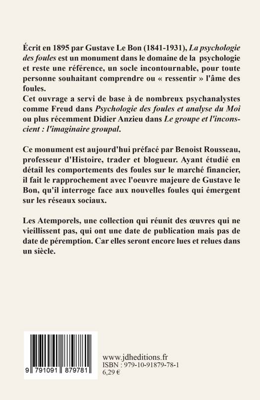 Écrit en 1895 par Gustave Le Bon (1841-1931), La psychologie des foules est un monument dans le domaine de la psychologie et reste une référence, un socle incontournable, pour toute personne souhaitant comprendre ou "ressentir" l'âme des foules. Cet ouvrage a servi de base à de nombreux psychanalystes comme Freud dans "Psychologie des foules et analyse du Moi" ou plus récemment Didier Anzieu dans "Le groupe et l'inconscient : l'imaginaire groupal".