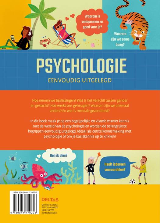 In dit boek maak je op een begrijpelijke en visuele manier kennis met de wereld van de psychologie en worden de belangrijkste begrippen eenvoudig uitgelegd. Aan de hand van duidelijke illustratiesen een heleboel praktijkvoorbeelden leer je over hoe mensen denken, zich voelen en zich gedragen. Je komt te weten hoe wetenschappers deze gevoelens en gedragingen onderzoeken en wat er in de hersenen van mensen omgaat.