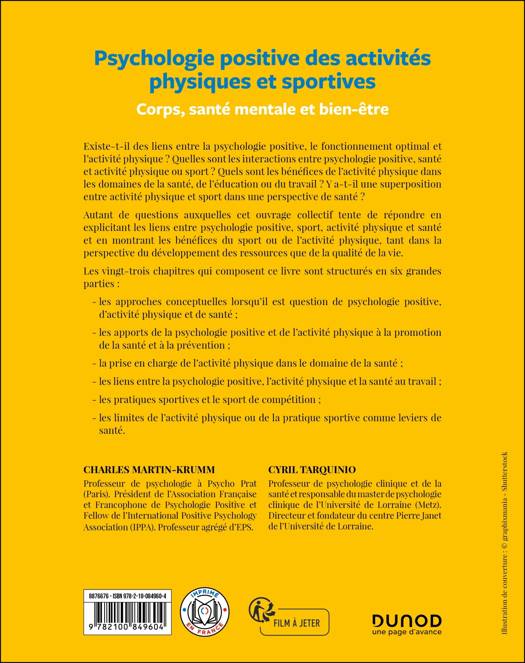 Cet ouvrage fait le point sur les liens existant entre activité physique, santé mentale et psychologie positive. Il aborde tout d'abord l'impact global positif de la pratique d'une activité physique sur la santé, non seulement dans une perspective de prévention primaire mais aussi de prise en charge. Sont ensuite développés l’intérêt et les mécanismes de ces bénéfices dans les champs du travail et du sport de compétition. Enfin sont présentés les risques associés à la pratique d’activités physiques : en effet, si l’activité physique présente indéniablement des avantages pour tous les pratiquants, elle peut aussi présenter des risques pour leur santé mentale.