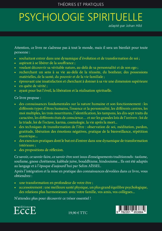 Attention, ce livre ne s’adresse pas à tout le monde, mais il sera un bienfait pour toute personne : souhaitant entrer dans une dynamique d’évolution et de transformation de soi ; aspirant à se libérer de la souffrance ; voulant découvrir sa véritable nature, au-delà de sa personnalité et de son ego ; recherchant un sens à sa vie au-delà de la réussite, du bonheur, des possessions matérielles, de la santé, du pouvoir et de la vie familiale ; éprouvant une insatisfaction et cherchant à donner à sa vie une dimension supérieure ; en quête de vérité ; ayant pour but l'éveil, la libération et la réalisation spirituelle. Ce livre propose : des connaissances fondamentales sur la nature humaine et son fonctionnement : les différents types d’êtres humains, l’essence et la personnalité, les différents centres, les moi multiples, les trois nourritures, l’identification, les tampons, les dix-sept traits du caractère, les différents états de conscience… et sur les grandes lois de l’univers : loi de la triade, loi de l’octave, karma, cosmologie, la vie après la mort... ; des techniques de transformation de l’être : observation de soi, méditation, pardon, gratitude, libération des émotions négatives, pratique de la bienveillance, répétition mantrique... ; des exercices pratiques dont le but est d’entrer dans une dynamique de transformation intérieure ; des propositions de réflexion. Ce savoir, ce savoir-faire, ce savoir-être sont issus d'enseignements traditionnels : taoïsme, soufisme, gnose chrétienne, kabbale juive, bouddhisme, hindouisme... Ils ont été adaptés au langage et à l’époque d’aujourd’hui par Selim Aïssel. Après l’intégration et la mise en pratique des connaissances dévoilées dans ce livre, vous obtiendrez : une transformation en profondeur de votre être ; accessoirement : une meilleure santé physique, un plus grand équilibre psychologique, des relations plus harmonieuses avec votre famille, vos amis, vos collègues... N’attendez plus pour découvrir ce trésor essentiel !