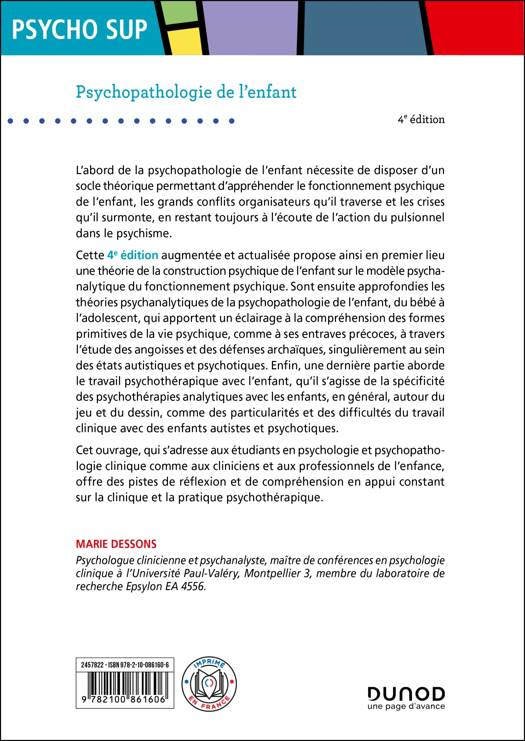 L’abord de la psychopathologie de l’enfant nécessite de disposer d’un socle théorique permettant d’appréhender le fonctionnement psychique de l’enfant, les grands conflits organisateurs qu’il traverse et les crises qu’il surmonte, en restant toujours à l’écoute de l’action du pulsionnel dans le psychisme. Cette 4e édition augmentée et actualisée propose ainsi en premier lieu une théorie de la construction psychique de l’enfant sur le modèle psychanalytique du fonctionnement psychique. Sont ensuite approfondies les théories psychanalytiques de la psychopathologie de l’enfant, du bébé à l’adolescent, qui apportent un éclairage à la compréhension des formes primitives de la vie psychique, comme à ses entraves précoces, à travers l’étude des angoisses et des défenses archaïques, singulièrement au sein des états autistiques et psychotiques. Enfin, une dernière partie aborde le travail psychothérapique avec l’enfant, qu’il s’agisse de la spécificité des psychothérapies analytiques avec les enfants, en général, autour du jeu et du dessin, comme des particularités et des difficultés du travail clinique avec des enfants autistes et psychotiques. Cet ouvrage, qui s’adresse aux étudiants en psychologie et psychopathologie clinique comme aux cliniciens et aux professionnels de l’enfance, offre des pistes de réflexion et de compréhension en appui constant sur la clinique et la pratique psychothérapique.