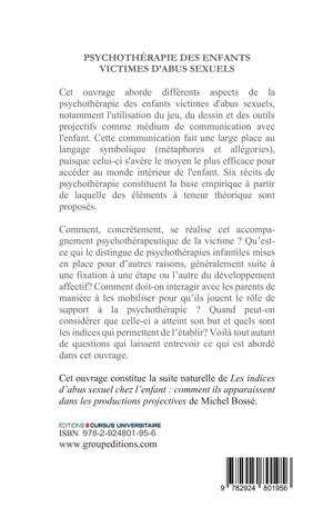 Cet ouvrage aborde différents aspects de la psychothérapie des enfants victimes d'abus sexuels, notamment l'utilisation du jeu, du dessin et des outils projectifs comme médium de communication avec l'enfant. Cette communication fait une large place au langage symbolique (métaphores et allégories), puisque celui-ci s'avère le moyen le plus efficace pour accéder au monde intérieur de l'enfant. Six récits de psychothérapie constituent la base empirique à partir de laquelle des éléments à teneur théorique sont proposés. Comment, concrètement, se réalise cet accompagnement psychothérapeutique de la victime? Qu’est-ce qui le distingue de psychothérapies infantiles mises en place pour d’autres raisons, généralement suite à une fixation à une étape ou l’autre du développement affectif? Comment doit-on interagir avec les parents de manière à les mobiliser pour qu’ils jouent le rôle de support à la psychothérapie? Quand peut-on considérer que celle-ci a atteint son but et quels sont les indices permettant de l’établir? Questions abordées.