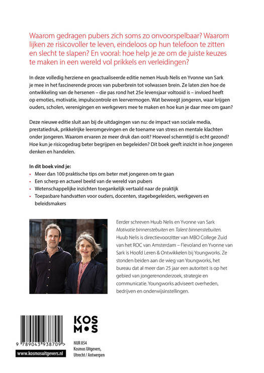 In deze volledig herziene en geactualiseerde editie nemen Huub Nelis en Yvonne van Sark je mee in het fascinerende proces van puberbrein tot volwassen brein. Ze laten zien hoe de ontwikkeling van de hersenen – die pas rond het 25e levensjaar voltooid is – invloed heeft op emoties, motivatie, impulscontrole en leervermogen. Wat beweegt jongeren, waar krijgen ouders, scholen, verenigingen en werkgevers mee te maken en hoe kun je daar mee om gaan?