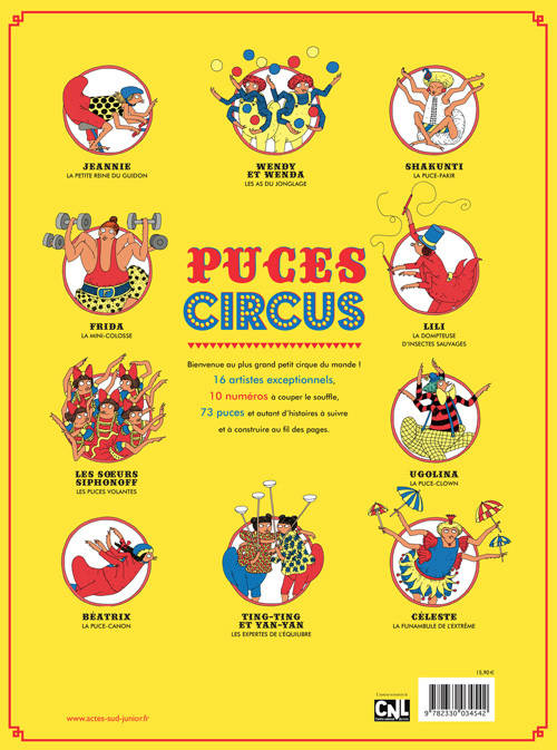 Bienvenue au PLUS GRAND PETIT CIRQUE du monde ! Seize artistes exceptionnels pour dix numéros à couper le souffle, parmi lesquels : Béatrix la puce-canon, Céleste la funambule sur fil à couper le beurre, Lili la dompteuse d'araignées, Shakunti la puce fakir ensorceleuse de lacets ou encore les soeurs Siphonoff, trapézistes de poche qui défient les lois de la gravité. Mini-artistes pour un album très très grand format dans lequel chaque numéro est une scène avec une foule de personnages à observer et de détails étonnants à découvrir. En fin d'ouvrage, une double page "documentaire" sur l'histoire des cirques à puces.