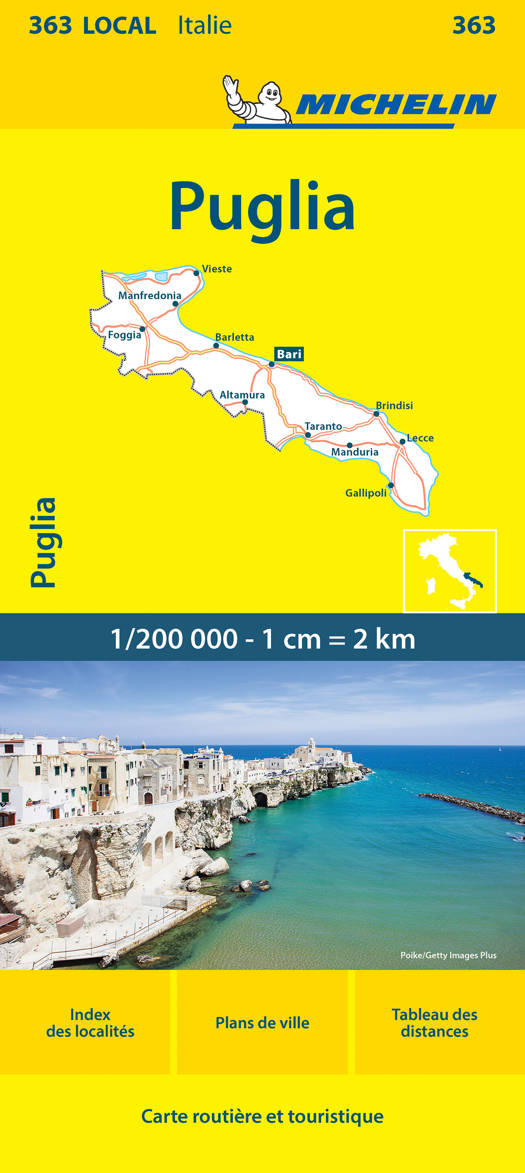 Met een schaal van 1/200 000 oftewel 1 cm = 2 km en reliëf van satellietbeeld biedt de Michelin LOCAL kaart Puglia u een exact beeld van de topografie. Dankzij de aangeraden toeristische trajecten laat ze u toe om alle rijkdom en plaatselijke bezienswaardigheden grondig te verkennen en de mooiste toeristische sites te ontdekken, uitgekozen en aangeduid door Michelin. Om u beter te verplaatsen kan u de plaatsenindex, de afstanden- en tijdtabellen en de stadsplattegronden gebruiken.