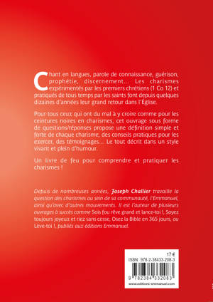 Chant en langues, parole de connaissance, guérison, prophétie, discernement… Les charismes expérimentés par les premiers chrétiens (1 Co 12) et pratiqués de tous temps par les saints font depuis quelques dizaines d’années leur grand retour dans l’Église. Pour ceux qui ont du mal à y croire comme pour les ceintures noires en charismes, ce petit livre sous forme de questions/réponses propose une définition simple et forte de chaque charisme, des conseils pratiques pour les exercer, des témoignages… Le tout avec le style vivant et plein d’humour cher à l’auteur. Un livre de feu pour comprendre et pratiquer les charismes.