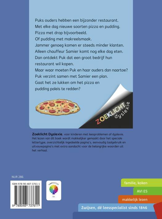 Dit boek in de serie Zoeklicht dyslexie is speciaal ontwikkeld voor kinderen die moeite hebben met lezen. Het boek is leestechnisch eenvoudiger, terwijl het verhaal aansluit bij de belevingswereld van kinderen vanaf 9 jaar. De ouders van Puk hebben een bijzonder restaurant: het pizza en pudding paleis. Zo hebben ze pizza met drop bijvoorbeeld. Of pudding met makreelsmaak. Helaas komen er steeds minder klanten. Dan ontdekt Puk dat een groot bedrijf hun restaurant wil kopen, help! Lukt het Puk om het restaurant te redden?