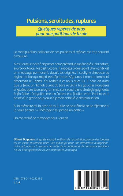 La manipulation politique de nos pulsions et réflexes est trop souvent à l'oeuvre. Ainsi l'auteur incite à dépasser notre prétendue supériorité sur la nature, source de toutes les destructions. Il rappelle à quel point l'humanité est un métissage permanent, depuis les origines. Il souligne l'impasse du régime taliban qui méprise et réprime les Afghanes. Il montre comment désormais le Capital s'autodétruit et nous avec lui. Il nous dit aussi que le front uni kanak aurait dû faire réfléchir les gauches françaises engluées dans leurs programmes, sans souci d'une stratégie gagnante. Enfin Gilbert Dalgalian met en évidence la filiation entre Poutine et le passé d'un grand pays qui n'a jamais achevé la déstalinisation. Si la mémoire est la base de tout, elle ne peut être la seule référence ni la seule finalité. Un concentré de messages pour l'avenir.