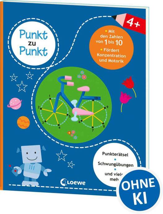 Kannst du schon von 1 bis 10 zählen? Dann zeichne alle Bilder fertig, indem du die Zahlen miteinander verbindest. Was für Dinge sich wohl hinter den Punkten verstecken? Doch es warten noch viel mehr Spiele auf dich. Fahre Linien nach, löse Schwungübungen und mache die bunten Bilder noch farbenfroher.
