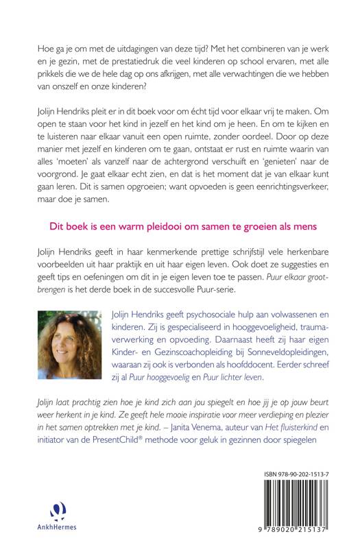 Puur elkaar grootbrengen, hoe (hooggevoelige) volwassenen en kinderen samen kunnen opgroeien van Jolijn Hendriks is het derde deel in haar succesvolle PUUR-reeks. Dit boek is bedoeld voor iedereen die openstaat voor het kind in zichzelf en het kind om zich heen. Kijken en luisteren naar elkaar vanuit een open ruimte (zonder oordeel) maakt dat we anders zien. Dan ontstaat er een open cirkel van pure ontmoeting, waarin we elkaar kunnen grootbrengen. In een tijd waarin zowel ouders als kinderen veel druk ervaren van onder andere school, werk en verwachtingen, schiet dit er nogal eens bij in. Dit boek is een pleidooi om écht tijd voor elkaar vrij te maken. We kunnen veel van elkaar leren als we er de tijd voor nemen.