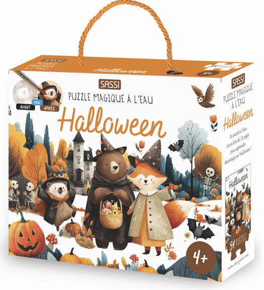 Une boîte contenant un puzzle de 54 pièces à colorier avec de l’eau et un livret de 16 pages. Mouille le puzzle et révèle les dessins : tu peux le colorier autant de fois que tu le souhaites ! Amuse-toi à découvrir tout l’univers de la nuit magique d’Halloween, une aventure monstrueuse et terriblement amusante t’attend !