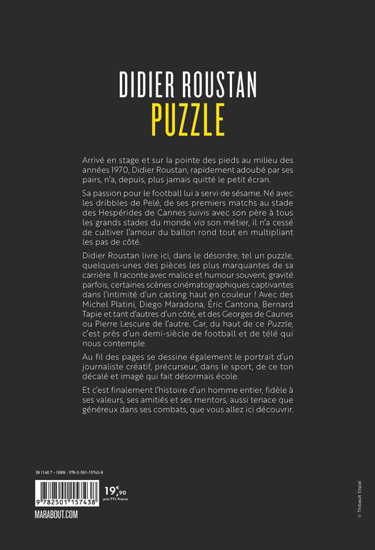 Didier Roustan livre ici, dans le désordre, Puzzle oblige, quelques-unes des pièces les plus marquantes de sa carrière. Il raconte avec malice et humour souvent, gravité parfois, certaines scènes cinématographiques captivantes dans l’intimité d’un casting haut en couleur ! Des Michel Platini, Diego Maradona, Éric Cantona, Bernard Tapie et tant d’autres d’un côté, à Georges de Caunes ou Pierre Lescure de l’autre. Car, du haut de ce Puzzle, c’est près d’un demi-siècle de football et de télé, qui nous contemple.