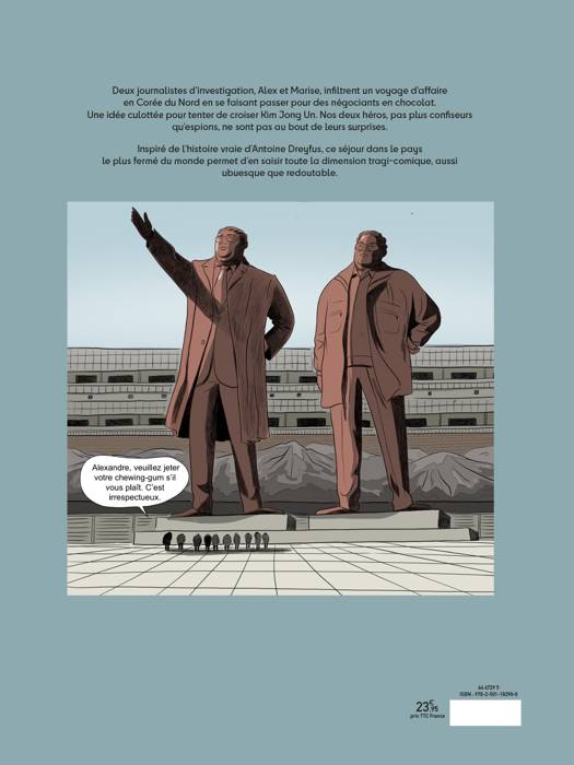 Une idée culottée pour tenter de croiser Kim Jong Un. Nos deux héros, pas plus confiseurs qu’espions, ne sont pas au bout de leurs surprises. Inspiré de l’histoire vraie d’Antoine Dreyfus, ce séjour dans le pays le plus fermé du monde permet d’en saisir toute la dimension tragi-comique, aussi ubuesque que redoutable.