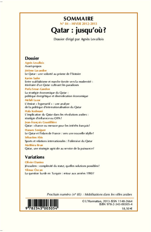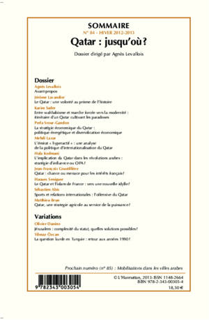 De quoi Qatar est-il le nom ? Cette réflexion revient comme un leitmotiv depuis des mois tant les interrogations sont grandes sur les visées de ce petit émirat de la péninsule arabique qui joue dans la "cour des grands" aussi bien sur les plans diplomatique, financier, culturel, médiatique, religieux que sportif. Au sommaire, entre autres : La stratégie économique du Qatar ; L'implication du Qatar dans les révolutions arabes ; Qatar et l'Islam de France : vers une nouvelle idylle ? ; Qatar : chance ou menace pour les intérêts français ?