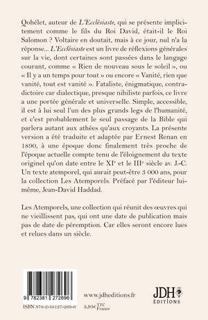 Qohélet, auteur de L'Ecclésiaste, qui se présente implicitement comme le fils du Roi David, était-il le Roi Salomon ? Voltaire en doutait, mais à ce jour, nul n'a la réponse... L'Ecclésiaste est un livre de réflexions générales sur la vie, dont certaines sont passées dans le langage courant, comme Rien de nouveau sous le soleil , ou Il y a un temps pour tout ou encore Vanité, rien que vanité, tout est vanité . Fataliste, énigmatique, contradictoire car dialectique, presque nihiliste parfois, ce livre a une portée générale et universelle. Simple, accessible, il est à lui seul l'un des plus grands legs de l'humanité, et c'est probablement le seul passage de la Bible qui parlera autant aux athées qu'aux croyants. La présente version a été traduite et adaptée par Ernest Renan en 1890, à une époque donc finalement très proche de l'époque actuelle compte tenu de l'éloignement du texte originel qu'on date entre le XIe et le IIIe siècle av. J.-C. Un texte atemporel, qui aurait peut-être 3 000 ans, pour la collection Les Atemporels. Préfacé par l'éditeur lui-même, Jean-David Haddad. Les Atemporels, une collection qui réunit des oeuvres qui ne vieillissent pas, qui ont une date de publication mais pas de date de péremption. Car elles seront encore lues et relues dans un siècle.