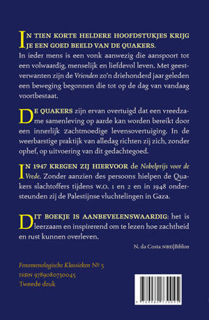In dit boek van de filosoof, literator en godsdienstwetenschapper Rufus Jones wordt de wezenskern van de Quakers op warmbloedige wijze belicht. De geschiedenis, religie, mentaliteit, pedagogische uitgangspunten en het humanitaire werk van de Quakers worden aangevuld met een artikel van Rudolf Otto over hun zwijgende eredienst. Ook is een compilatie van een lezing die Abraham Joshua Heschel hield voor een quakerbijeenkomst in het Duitsland van vlak voor de oorlog toegevoegd. Een lezing die aan actualiteit nog niets heeft ingeboet.