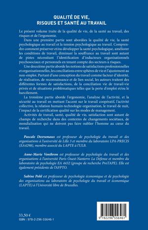 Cet ouvrage traite de la qualité de vie, de la santé au travail, des risques et de l'ergonomie, en abordant de nombreuses questions : tension psychologique au travail, conciliation vie de travail-vie privée, harcèlement, sécurité au travail, travail de nuit, etc.