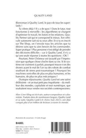 Bienvenue à Quality Land, le pays de tous les superlatifs ! Tu vibres déjà ? Il y a de quoi ! Dans le futur, tout fonctionne à merveille : les algorithmes se chargent d'optimiser le travail, les loisirs et les relations. Quality Partner sait qui te correspond le mieux. Ton véhicule autonome sait où tu veux aller. Et si tu es inscrit sur The Shop, on t'envoie tous les articles que tu désires sans que tu aies besoin de les commander. Super pratique ! Plus personne n'est obligé de prendre des décisions difficiles - car à Quality Land, il n'y a qu'une seule réponse à toutes les questions : OK ! Pourtant, Peter Chômeur est taraudé par l'impression que quelque chose cloche dans sa vie. Si le système est vraiment si parfait, pourquoi trouve-t-on des drones ayant le mal de l'air ou des robots de combat souffrant de stress post-traumatique ? Pourquoi les machines sont-elles de plus en plus humaines, et les humains, de plus en plus mécaniques ? Dystopie réjouissante, "Quality Land" est une satire drôlissime - et un tout petit peu inquiétante - du meilleur des mondes, capitaliste et tout numérique, que souhaitent nous vendre nos sociétés contemporaines.