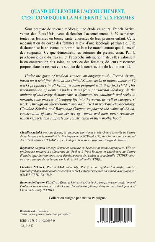 Sous prétexte de science médicale, une étude en cours, French Arrive, venue des États-Unis, veut déclencher l'accouchement, à 39 semaines, toutes les femmes en bonne santé, enceintes de leur premier enfant. Cette mécanisation du corps des femmes relève d'une idéologie patriarcale. Elle déshumanise la naissance et normalise la mise monde autant que le travail des soignants. Ce que démontrent les auteures du présent essai. Par la psychosociologie du travail, et l'approche interactionniste, elles valorisent la co-construction des soins, au service des femmes, de leurs ressources propres, dans le respect et le soutien de la construction de leur maternité.