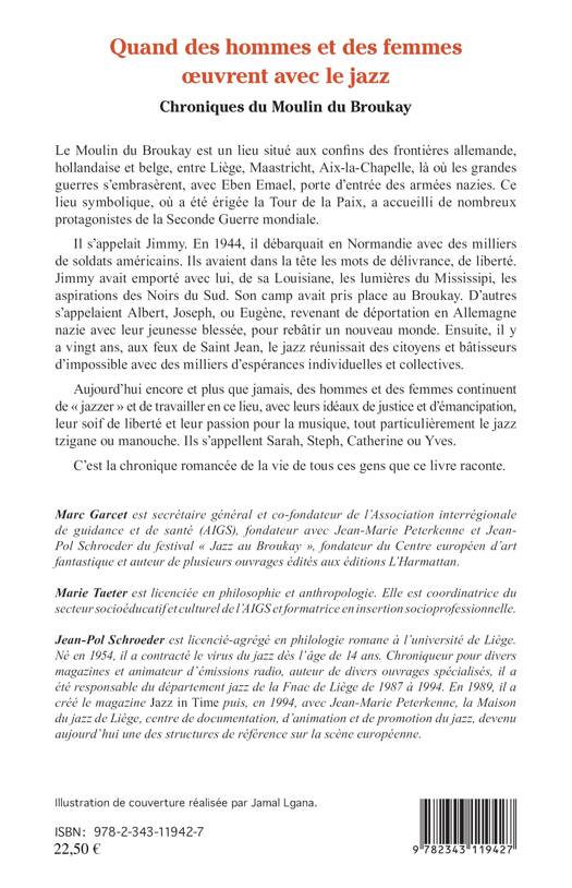 Le Moulin du Broukay est un lieu situé aux confins des frontières allemande, hollandaise et belge, entre Liège, Maastricht, Aix-la-Chapelle, là où les grandes guerres s'embrasèrent, avec Eben Emael, porte d'entrée des armées nazies. Ce lieu symbolique, où a été érigée la Tour de Paix, a accueilli de nombreux protagonistes de la Seconde Guerre mondiale. Aujourd'hui encore et plus que jamais, des hommes et des femmes continuent de "jazzer" et de travailler en ce lieu, avec des idéaux de justice et d'émancipation. C'est la chronique romancée de la vie de tous ces gens que ce livre raconte.
